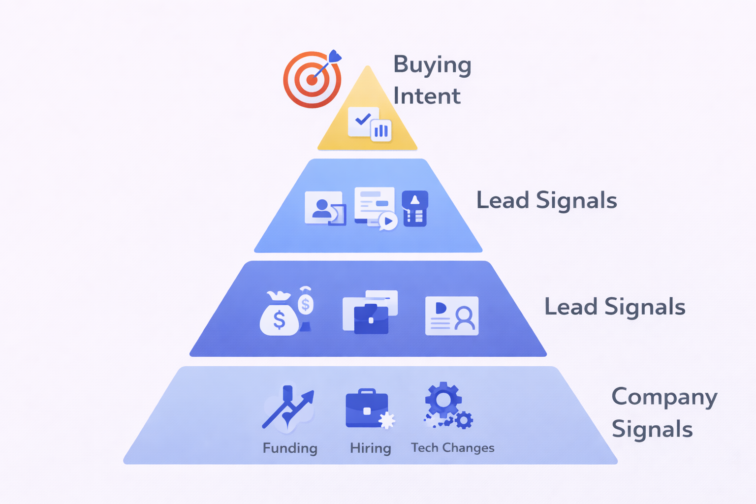 Company-level signals track funding rounds, hiring sprees, and tech stack changes. If a company just raised Series B funding, they’re probably buying new tools soon.