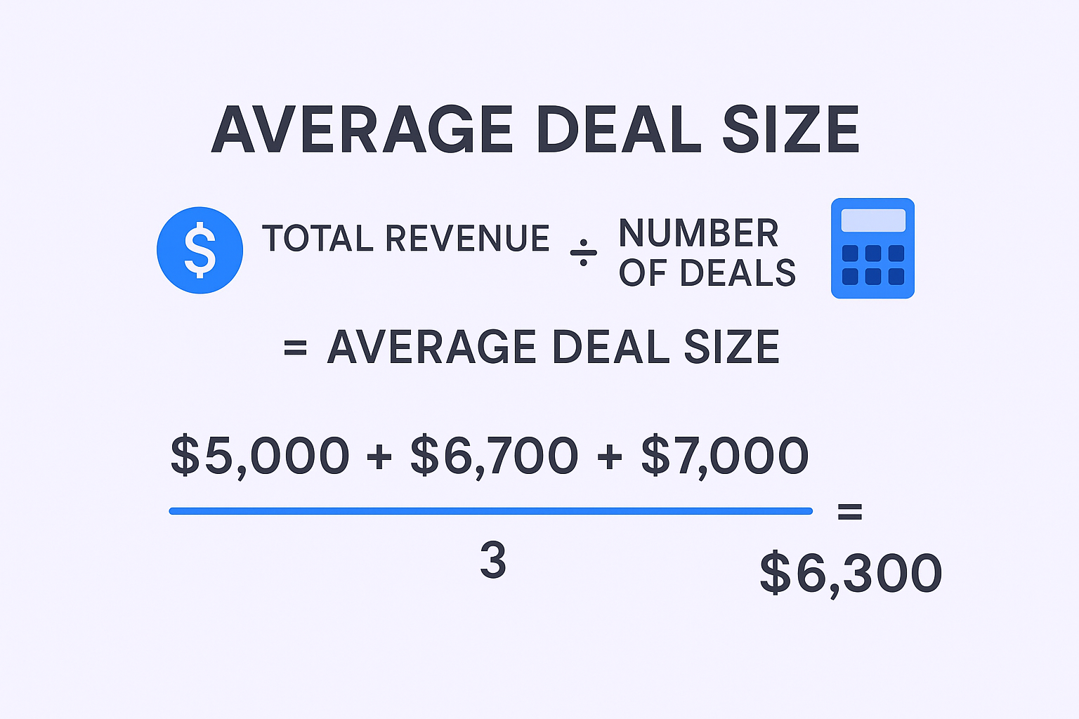 Here’s a quick example: Say you close three deals in a quarter worth $5,000, $6,700, and $7,000. Your total revenue is $18,900. Divide that by three deals, and your average deal size is $6,300.