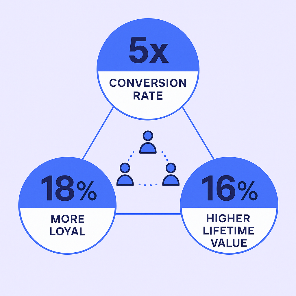 Referrals are the gold standard of B2B leads. 93% of B2B buyers trust word-of-mouth recommendations over any other form of marketing. Referred customers convert 5x more often, stay 18% more loyal, and deliver 16% higher lifetime value.