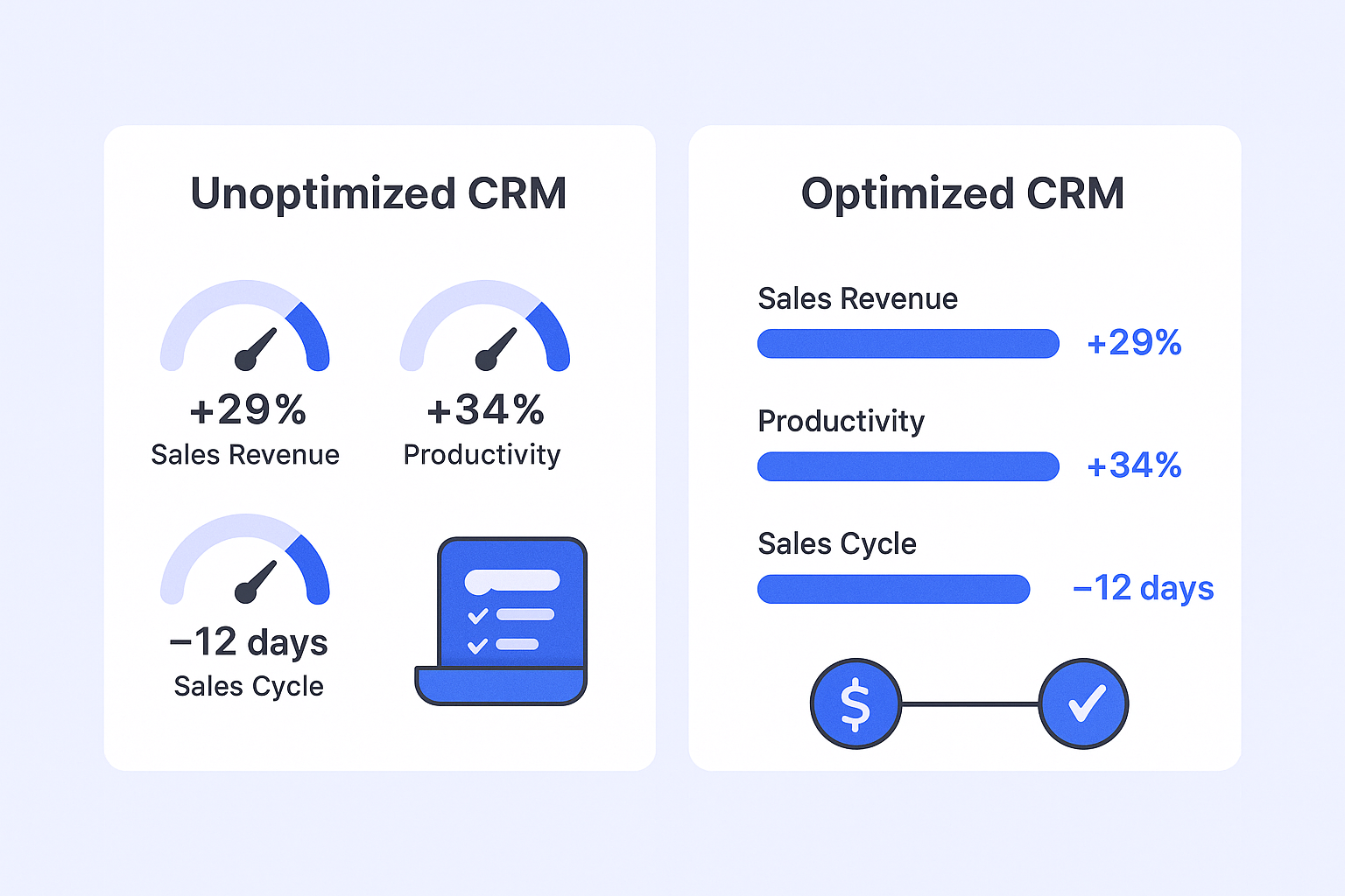 Well-implemented CRMs increase sales revenue by 29%, boost productivity by 34%, and shorten sales cycles by 8-14 days. But simply having a CRM isn’t enough – it must be continuously optimized.