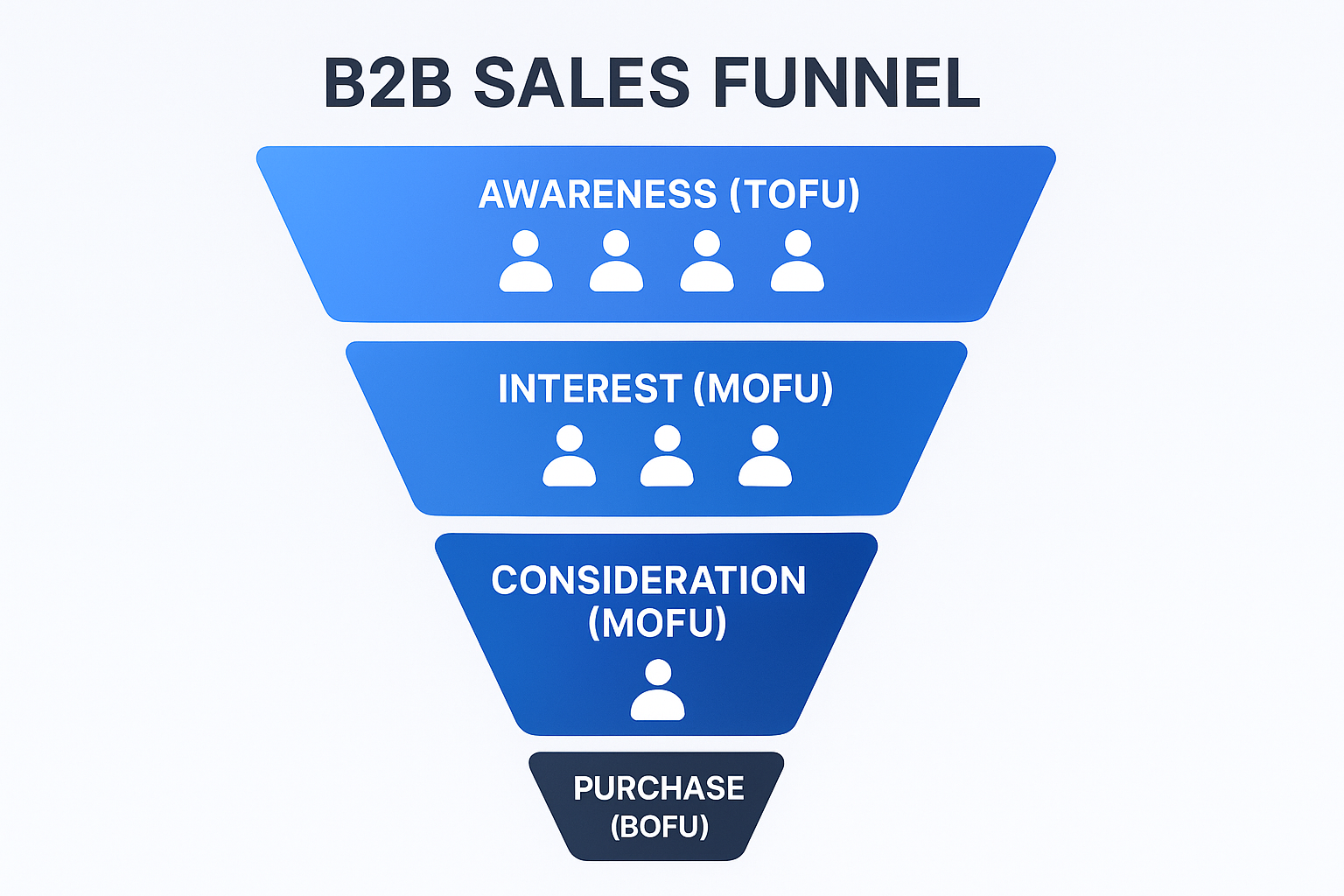 A B2B sales funnel is your strategic roadmap for guiding prospects from their first interaction with your brand all the way to becoming paying customers. Unlike B2C funnels that focus on quick emotional decisions, B2B funnels account for longer sales cycles, multiple stakeholders, and complex decision-making processes.
