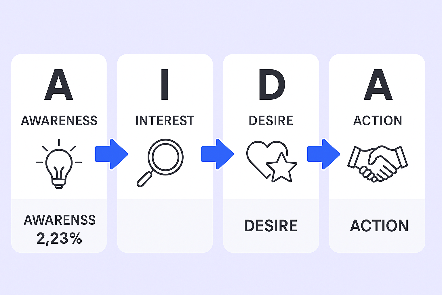 The classic AIDA framework provides a proven structure for understanding customer psychology at each funnel stage. This model helps you tailor messaging and activities to match your prospect’s current mindset.