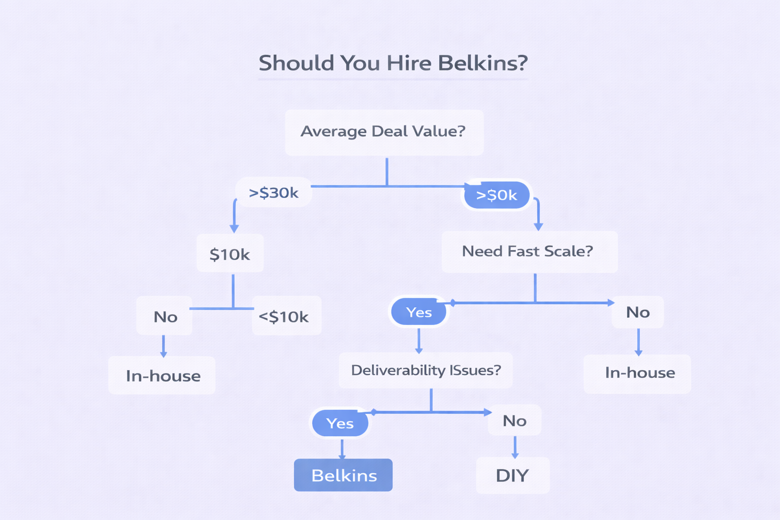 Need to scale fast. Building an internal team takes 6-12 months. Belkins can have campaigns running in 4-6 weeks.