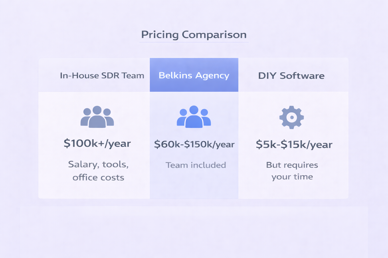 The Belkins lead generation agency operates as your external outbound team. Think of them as renting a fully-equipped sales development department instead of building one.