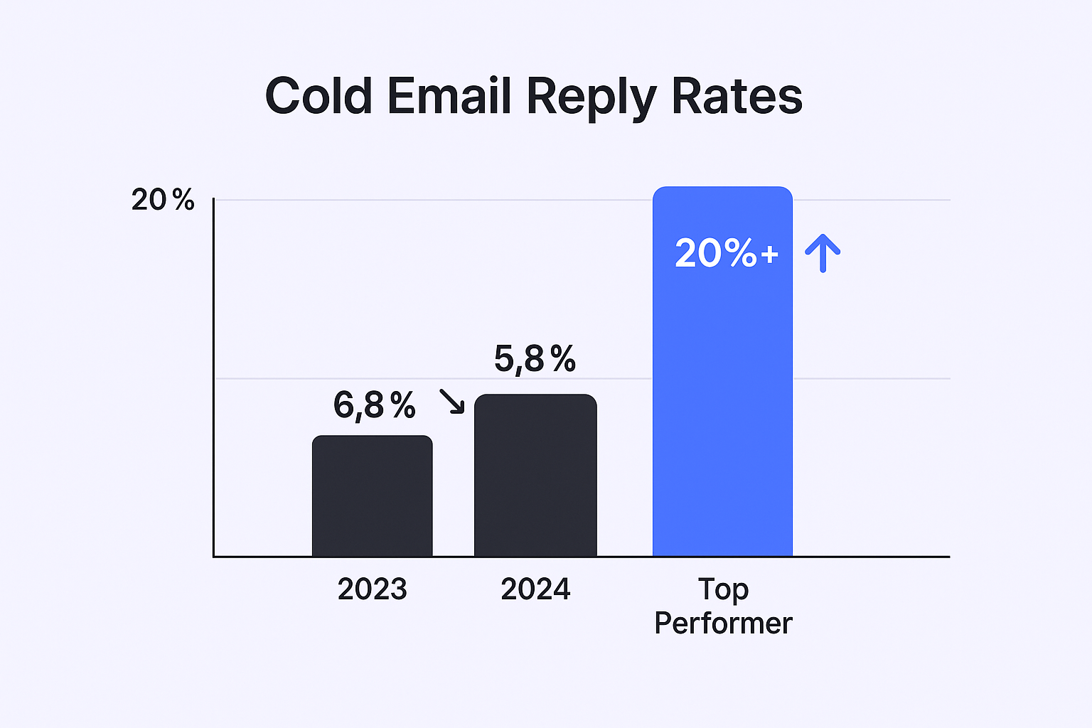 The numbers tell the story: cold email reply rates dropped from 6.8% in 2023 to 5.8% in 2024 – a 15% decline that has many questioning whether email marketing still works. But here’s the twist: top-performing campaigns are still achieving reply rates of 20% or higher. The difference? They’ve abandoned mass blasting in favor of hyper-personalized, AI-assisted outreach.