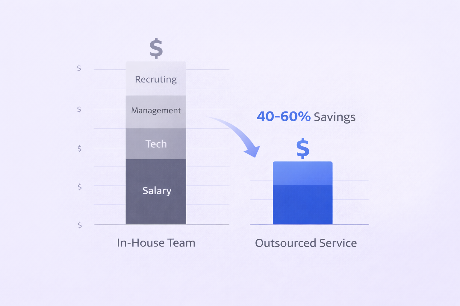 The fully-loaded cost of an internal team includes far more than salary. You’re paying for recruiting fees, benefits, management overhead, technology stack, training programs, and the opportunity cost of 3-4 month ramp time.