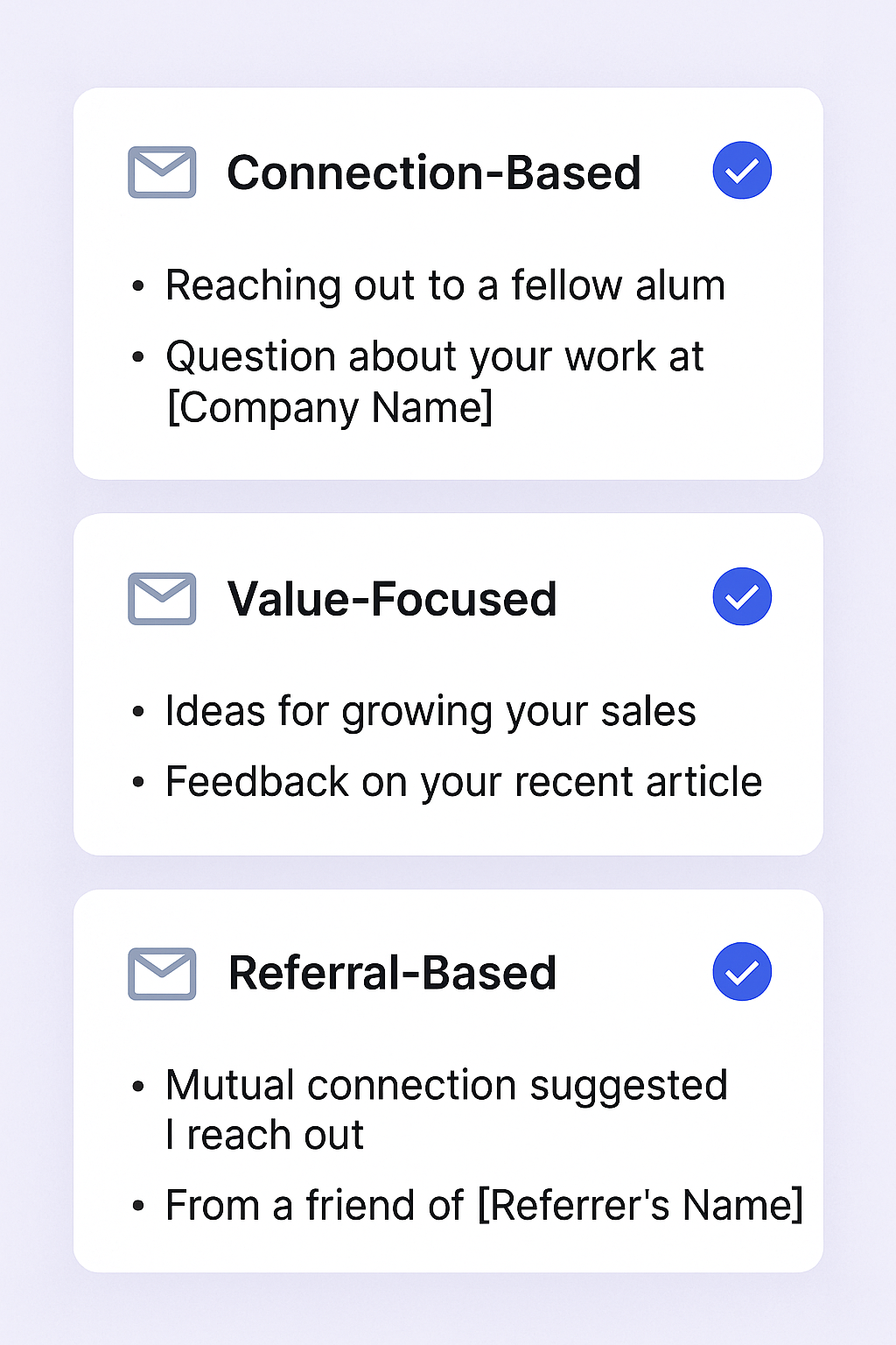 Here are actionable cold email templates that apply proven principles. Customize these frameworks with your specific details and research.