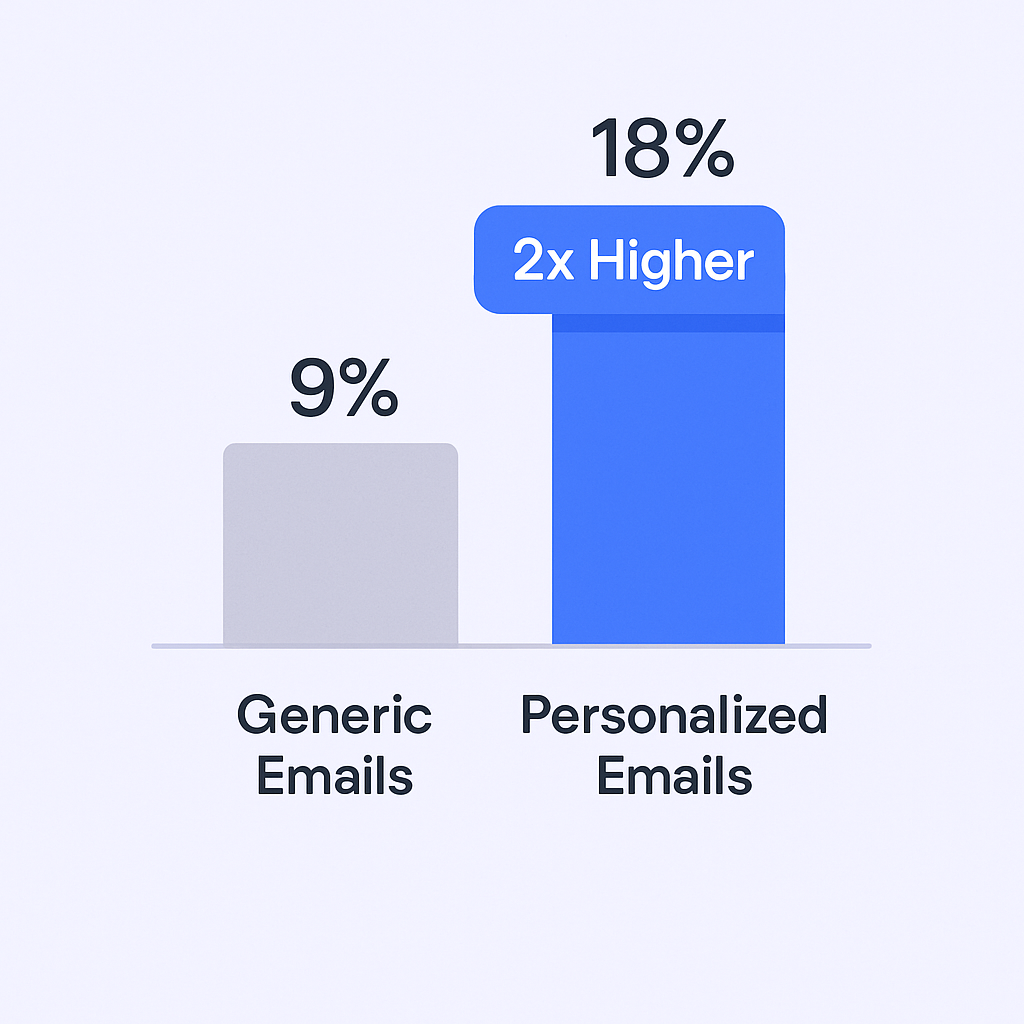 Basic {{FirstName}} and {{CompanyName}} merge tags are no longer enough to stand out. True ROI comes from deeper, more meaningful personalization that shows genuine research. Emails with personalized message bodies have a 32.7% better response rate than those that don’t personalize their messages.