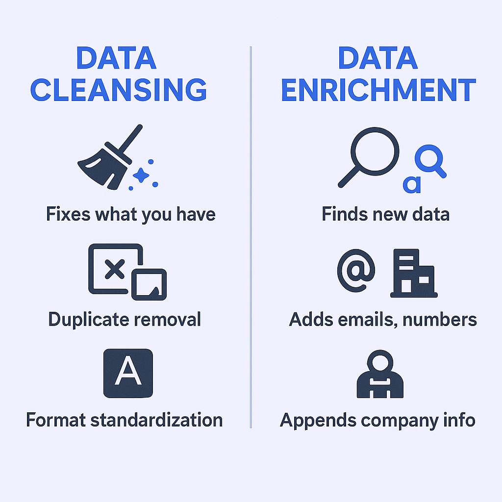 - Data Cleansing fixes what you already have—correcting typos, removing duplicates, and standardizing formats. It’s like organizing your closet.
