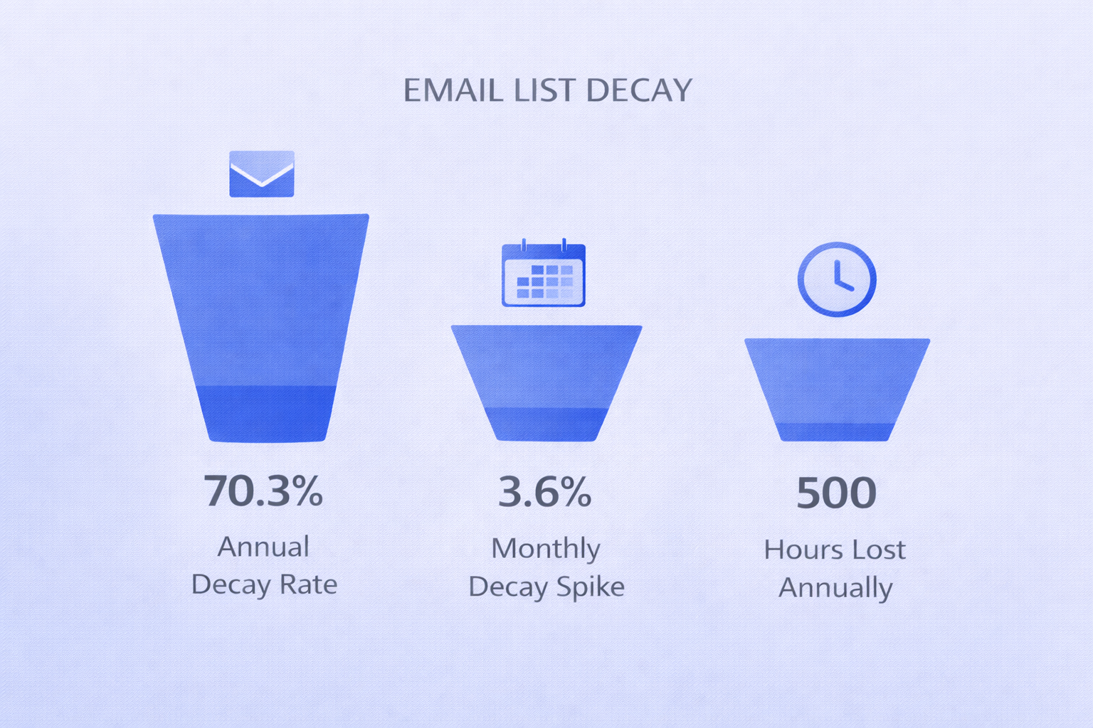 Your contact database is quietly destroying your outreach results. Right now, your carefully built email list is decaying at 70.3% per year—meaning most of your contacts will be outdated within 12 months. For anyone running cold outreach campaigns, this invisible data rot is costing you meetings, revenue, and sender reputation.