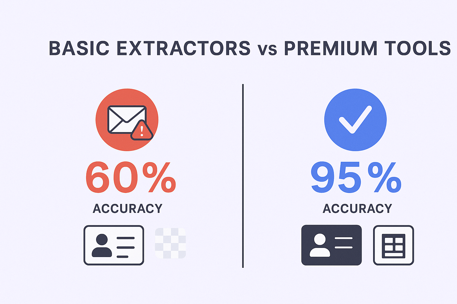 Many free and low-cost extractors provide email addresses with accuracy rates below 60%. This means 4 out of 10 emails bounce, damaging your sender reputation and wasting outreach efforts.