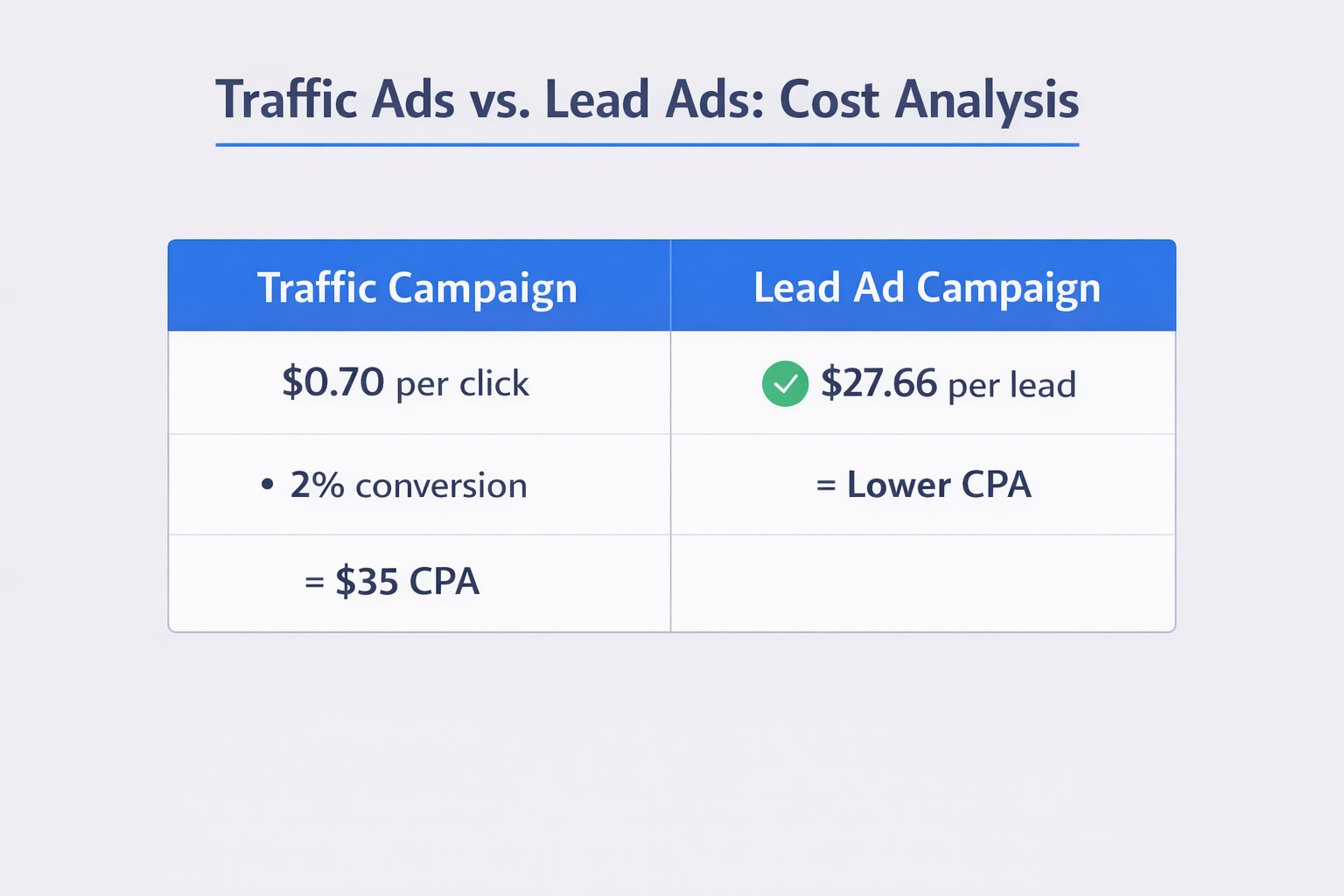 Compare this to driving traffic to a landing page. At $0.70 per click and a 2% conversion rate, you’re paying $35 per lead. The Instant Form at $27.66 is actually cheaper—if you have the software to follow up fast enough.