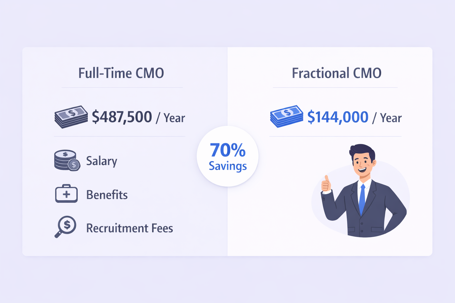 Here’s what’s happening: The average CMO only lasts 28-42 months in their role. Companies are tired of the hiring treadmill. They’re done paying $487,500+ per year for full-time executives who might bounce in two years.