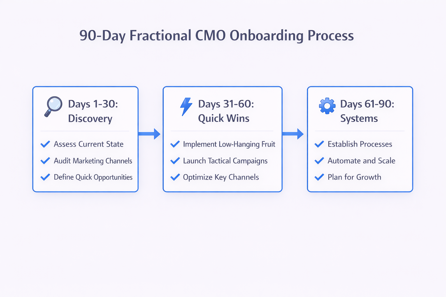 The best fractional engagements follow a 90-day sprint structure: