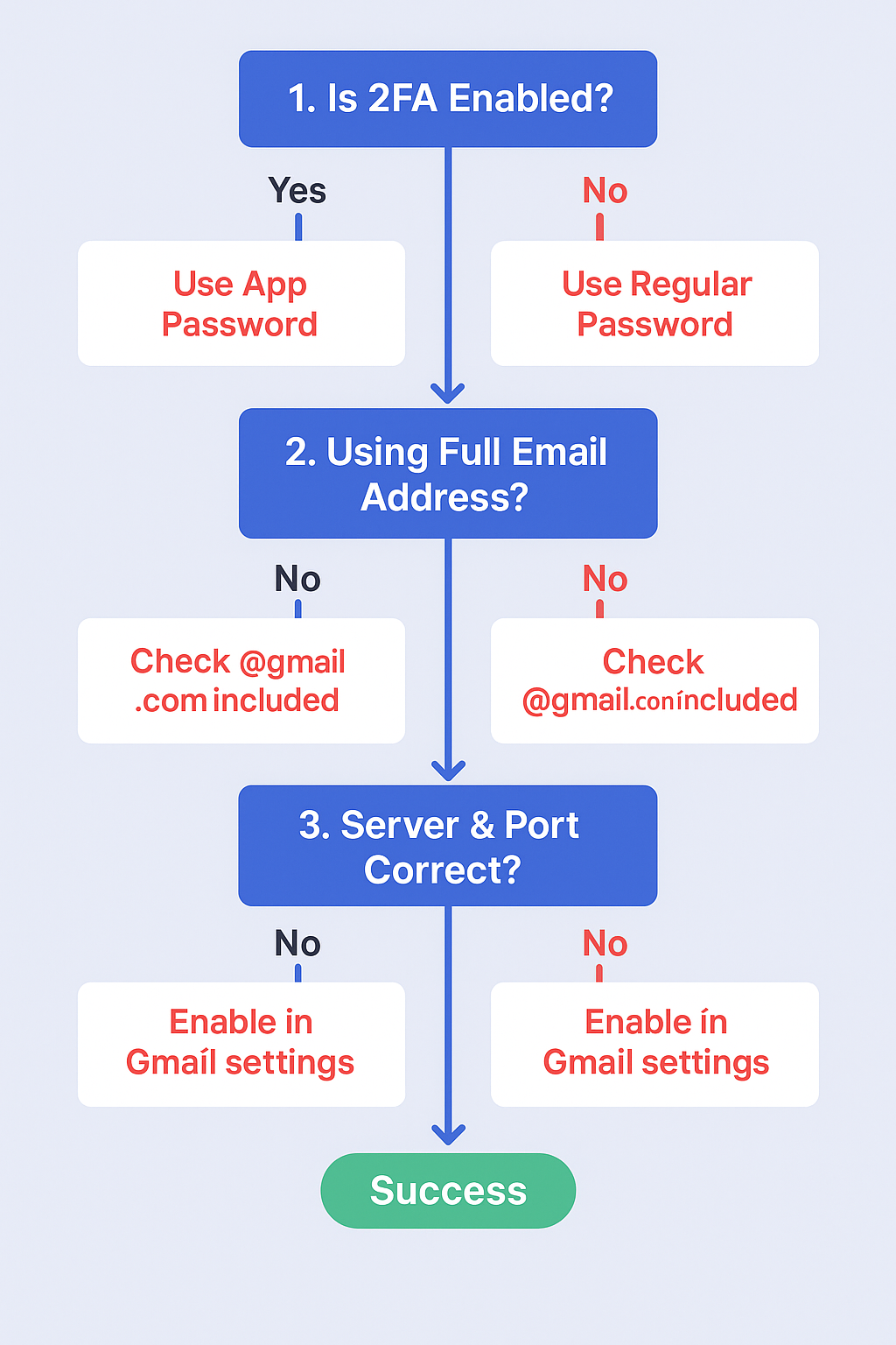 Authentication errors are the most common SMTP setup issues. Here’s your systematic troubleshooting checklist: