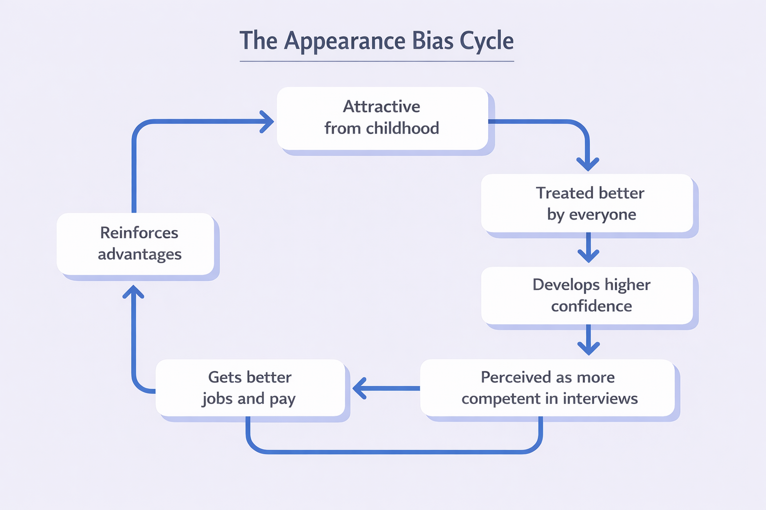 This creates a vicious cycle. Because attractive people are treated better throughout their lives, they often do develop higher confidence and better social skills. Then hiring managers see that confidence and think “great soft skills,” never realizing the confidence itself came from years of positive reinforcement based on appearance.