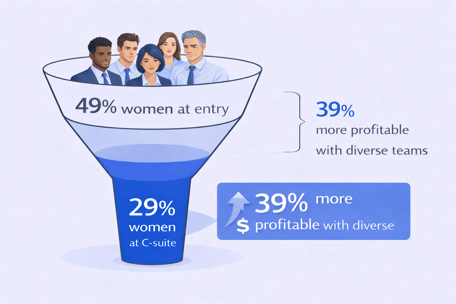 • Women: 49% of entry-level positions but only 29% of C-suite – not because women lack ambition but because they lack sponsorship with broken rung preventing advancement at every level