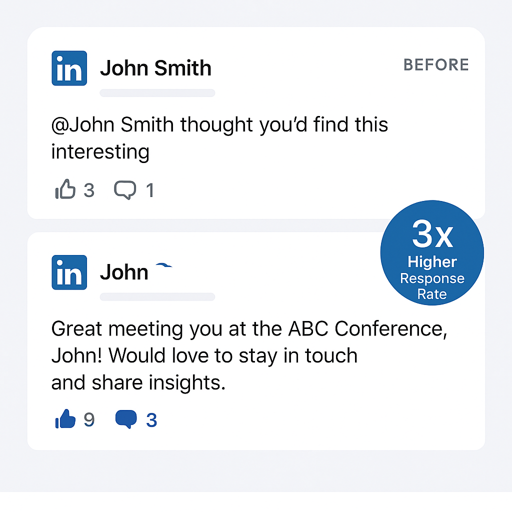 Example of Strategic Messaging: Instead of simply writing “@John Smith thought you’d find this interesting,” try: “@John Smith your recent insights about AI in healthcare make you the perfect person to weigh in on this new research. What’s your take on how this might impact patient outcomes?”