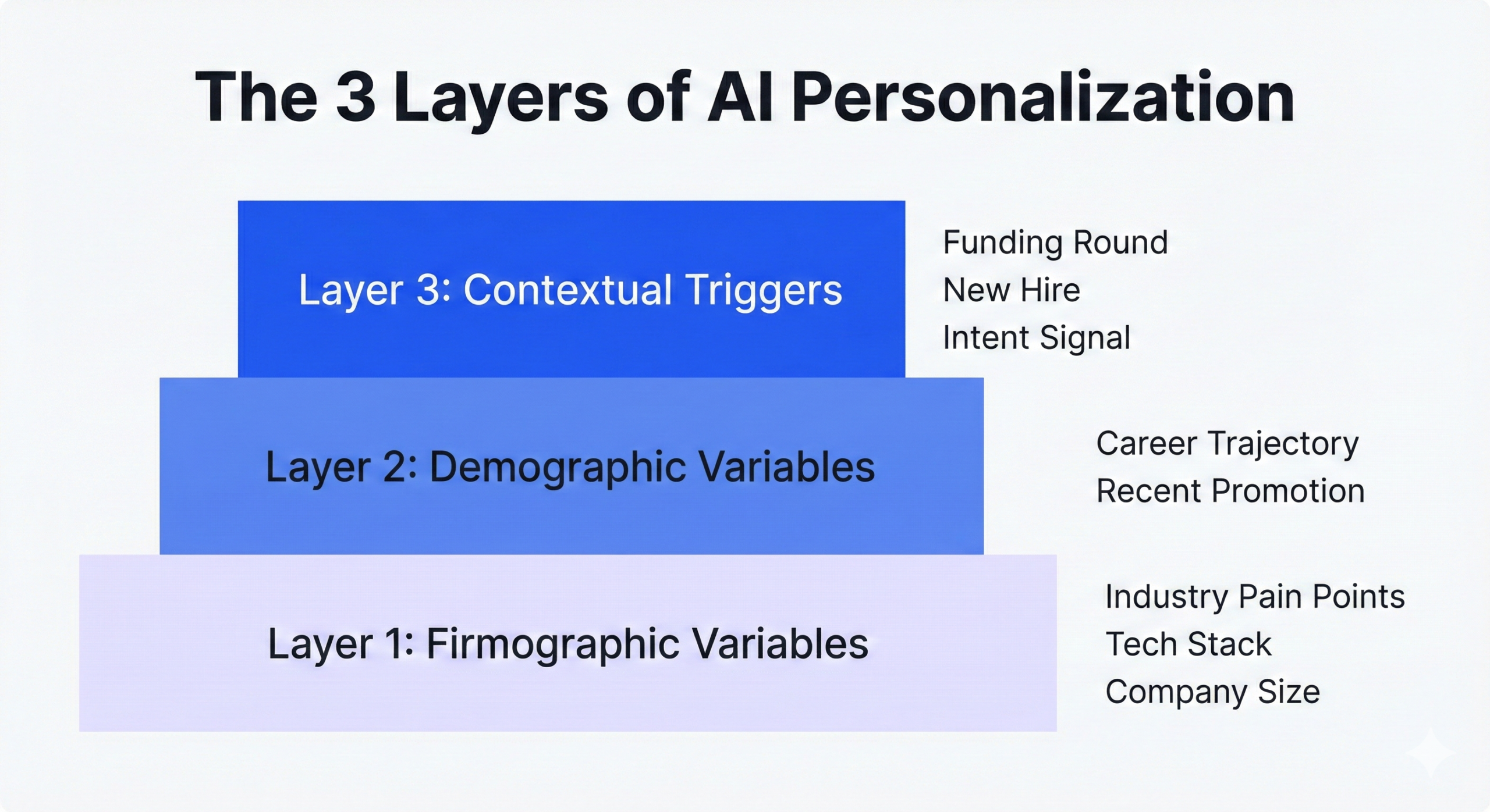 Layer 1 — Firmographic Variables: This is the baseline — industry, company size, revenue range, and technology stack. AI can detect if a prospect is using a legacy CRM and automatically pivot the value proposition to lead with migration ease instead of new features. Same message, delivered differently.