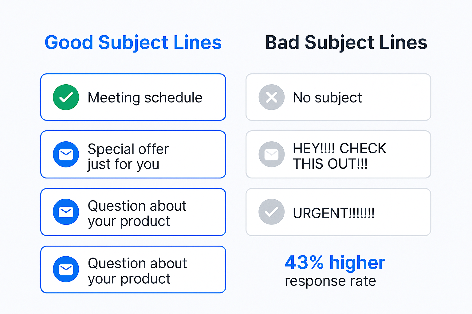 Vague subjects like “Following up” or “Quick question” provide no context and often get deleted. 91% of professionals check email on mobile devices, where subject lines get cut off after 30-35 characters.
