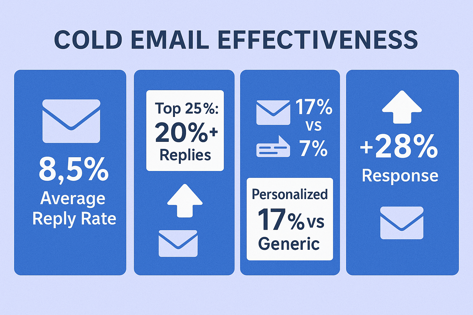 Cold Email Still Works: The average cold email reply rate is 8.5%, but the top 25% of cold email campaigns achieve reply rates of 20% or more.
