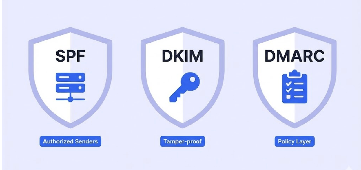 SPF (Sender Policy Framework): Tells receiving servers exactly which mail servers are authorized to send on behalf of your domain.