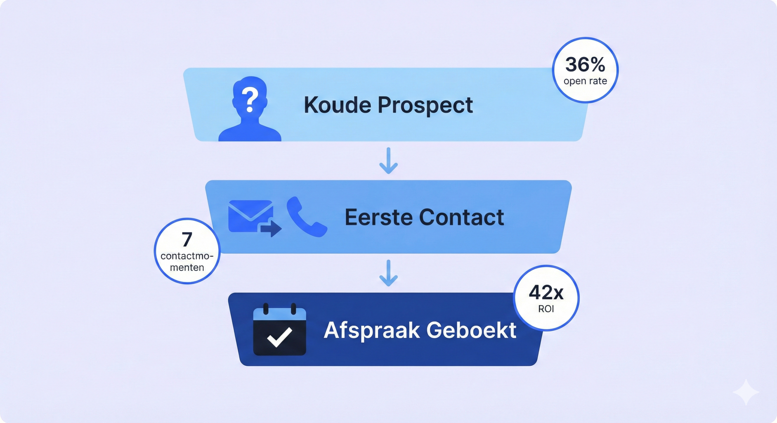 Eén bericht is nooit genoeg. Onderzoek toont aan dat het gemiddeld 7 contactmomenten kost voordat een prospect bereid is een gesprek aan te gaan. De slimme aanpak combineert meerdere kanalen in een logische volgorde.