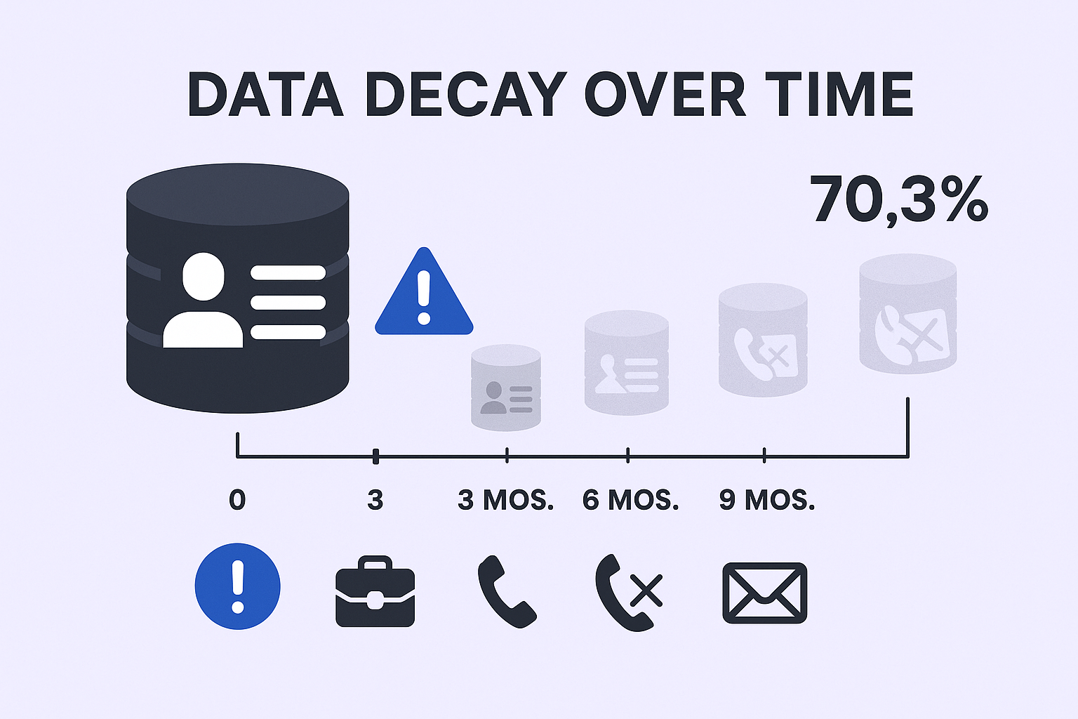 B2B contact data decays at an alarming rate—up to 70.3% per year. People change jobs, get promoted, switch phone numbers, and companies get acquired. Without a system to keep data fresh, your contact database becomes less valuable every single day.
