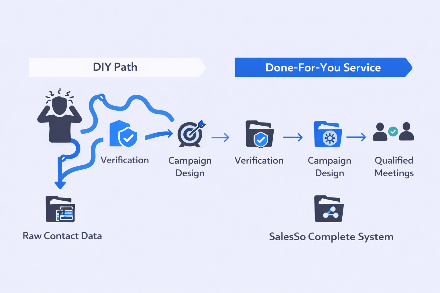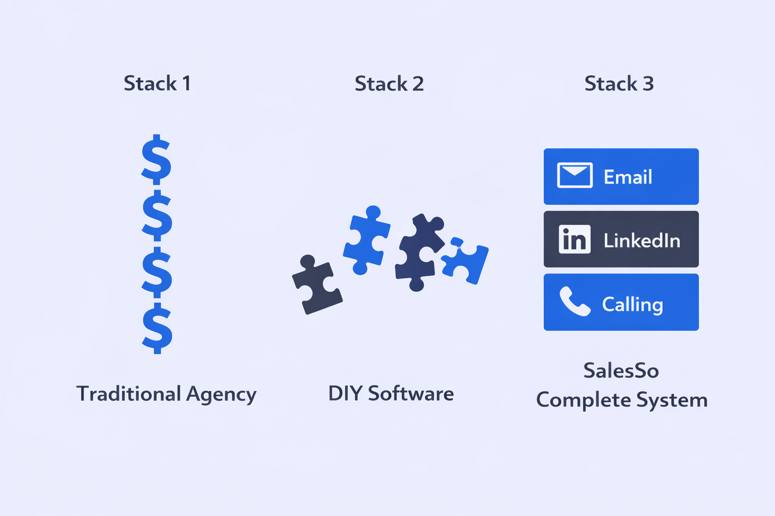 The hidden cost most teams miss? Time to competence. DIY approaches take 3-6 months to optimize. Agencies deliver faster but at premium cost. Done-for-you services like SalesSo split the difference.