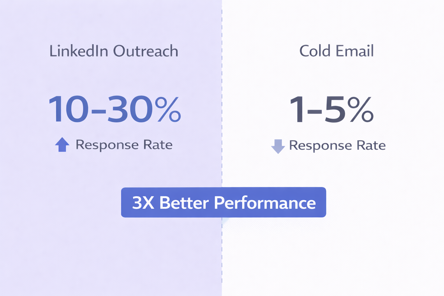 Left side shows “LinkedIn Outreach” with large bold “10-30%” text in color #2A5AF8 with subtext “Response Rate” below it. Include upward arrow icon.