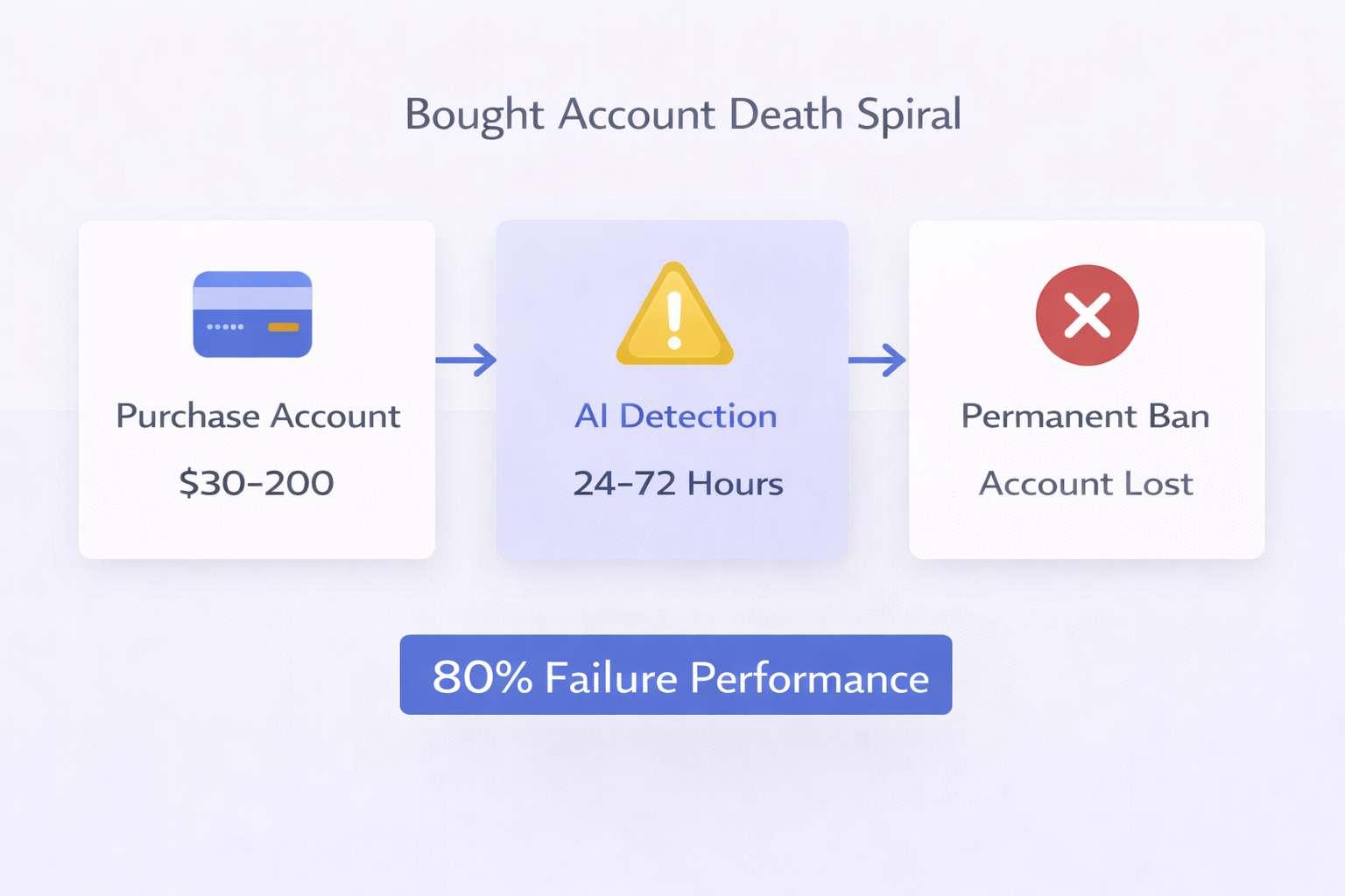 - 80% of purchased LinkedIn accounts fail within 72 hours