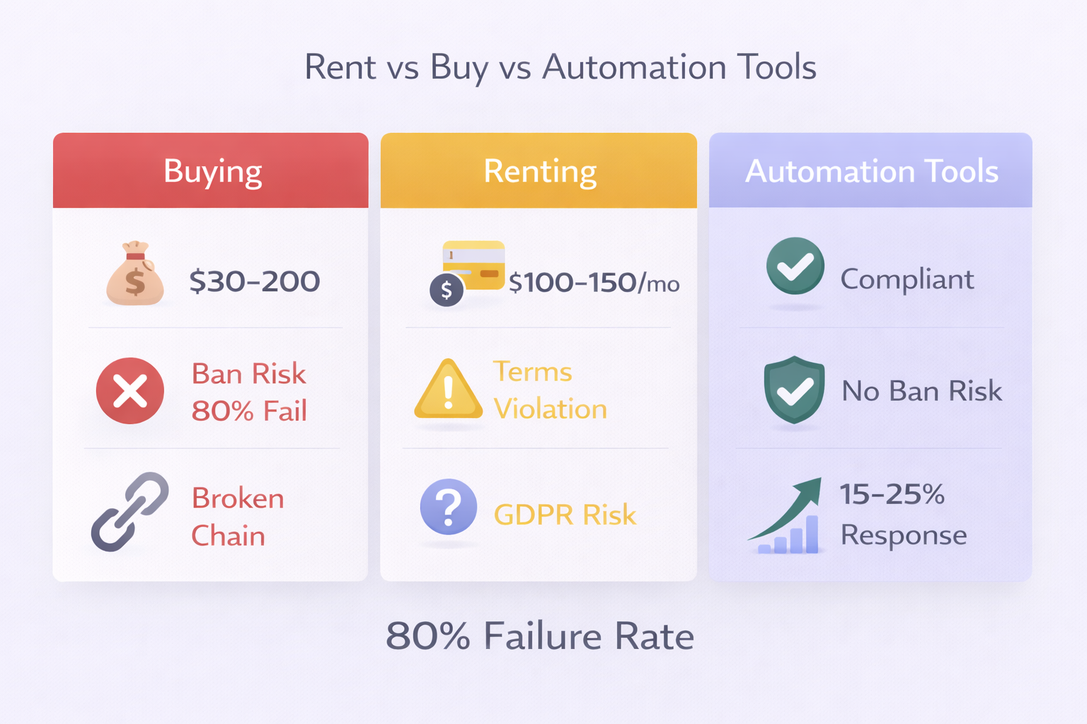 Costs more upfront than buying sketchy accounts. But you’re not risking bans, GDPR violations, or reputation damage.