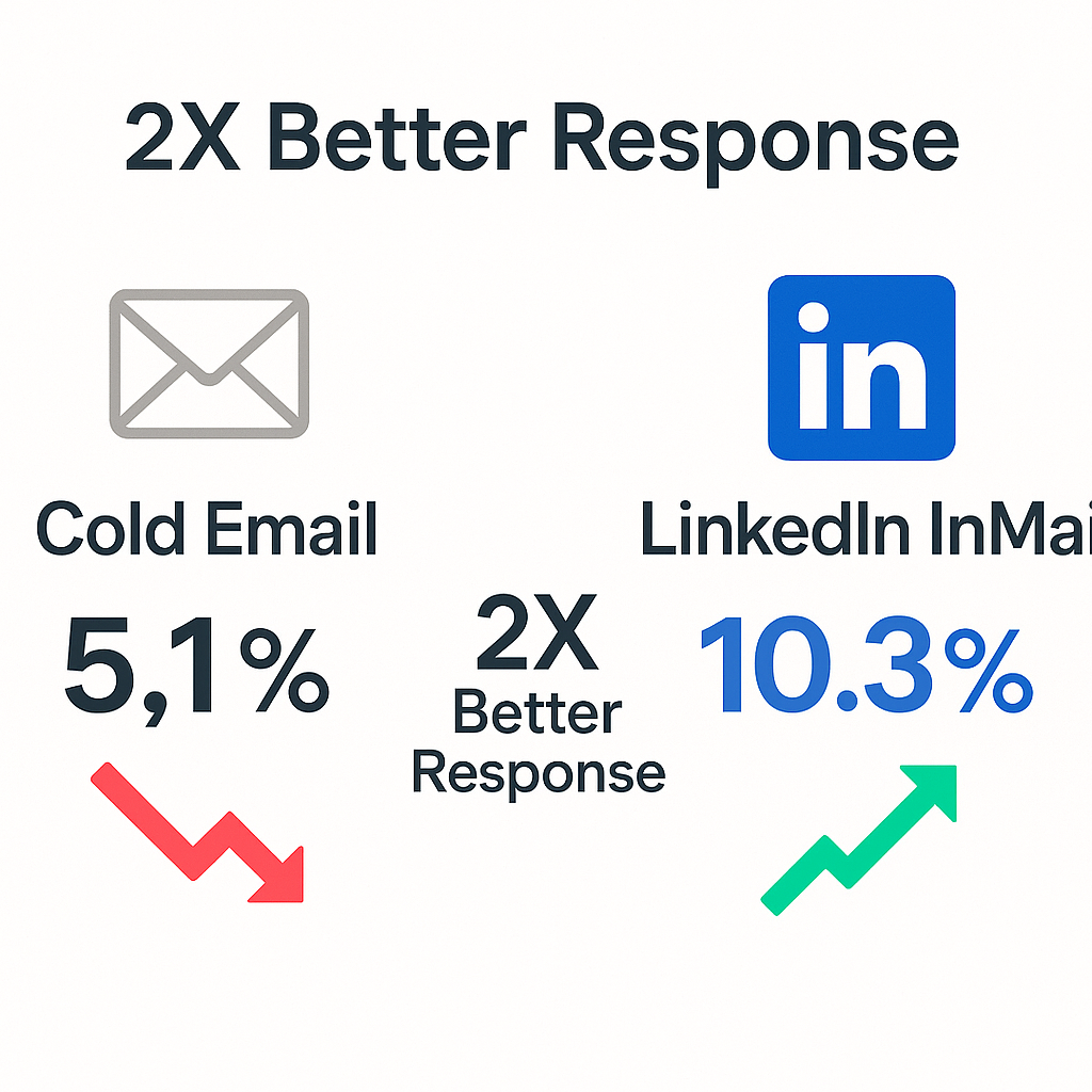 - LinkedIn InMail delivers a 10.3% response rate – effectively double cold email’s 5.1%, with open rates consistently exceeding 50%