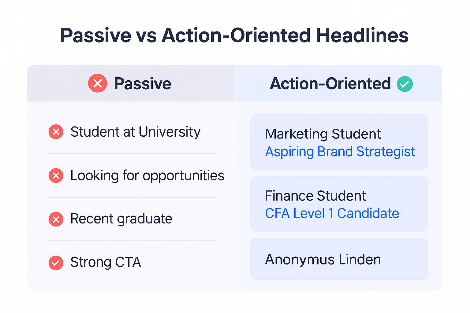 Good headline: “Marketing Student | Aspiring Brand Strategist | Passionate About Consumer Psychology”