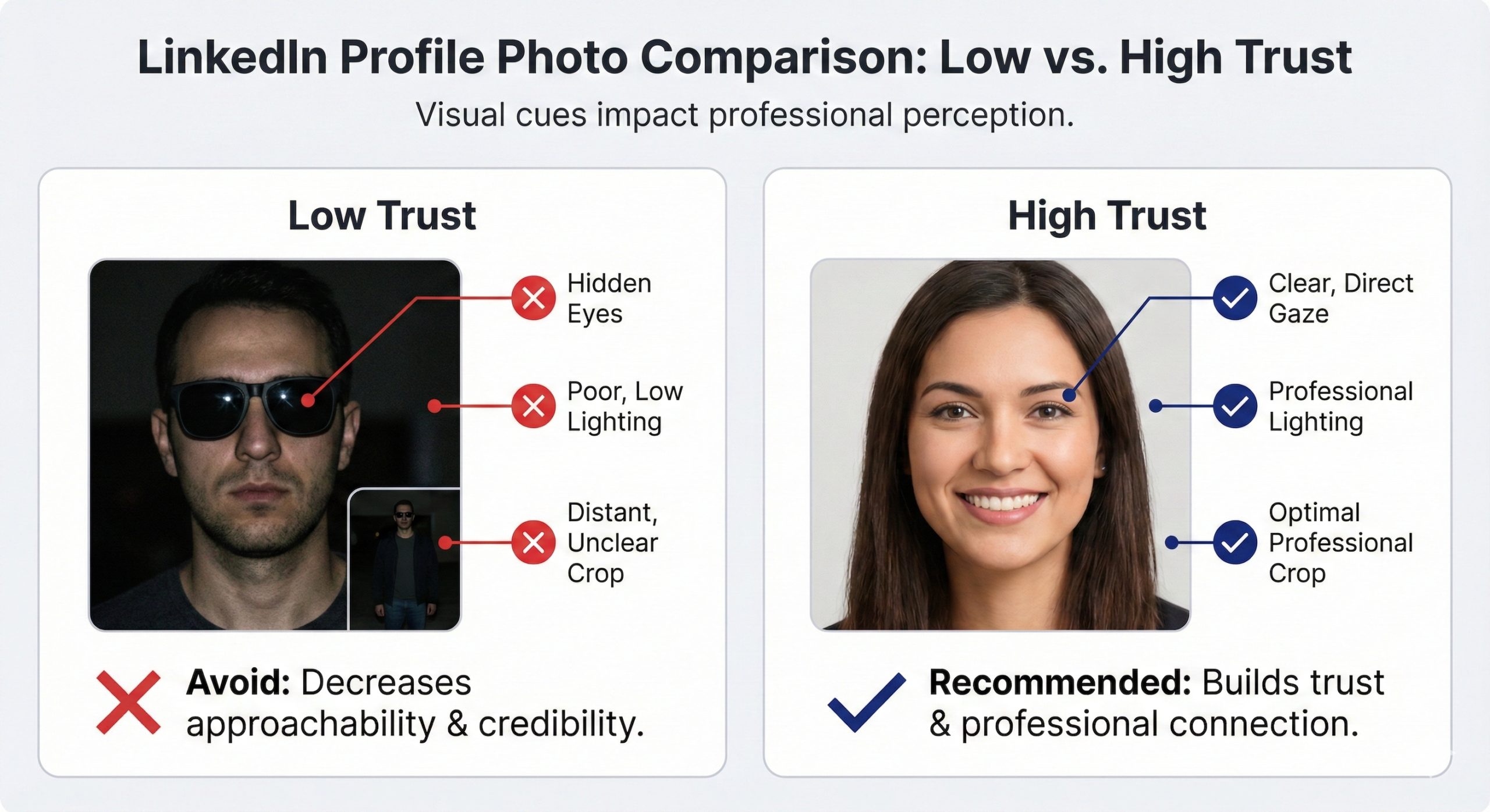Your eyes must be clearly visible. Sunglasses, shadows, or hair obscuring your eyes kills trust instantly. The eyes are how humans read sincerity. Block them and you block connection.
