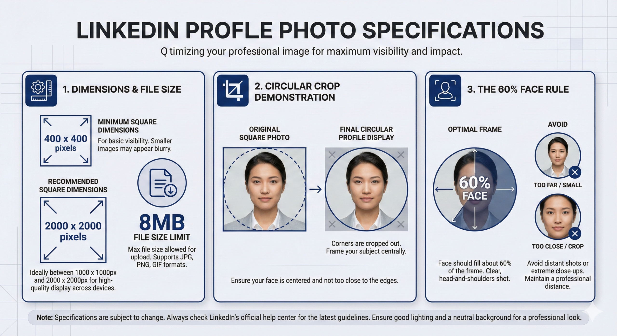 - Face should occupy roughly 60% of frame – LinkedIn displays photos as circles, too much space makes face unrecognizable in thumbnail view