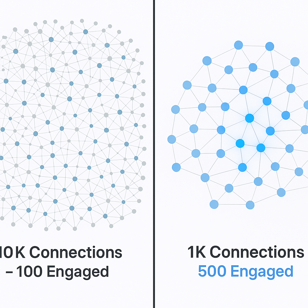 Quality beats quantity every time. A smaller, engaged network that actually sees and interacts with your content will generate better opportunities than thousands of ghost connections.