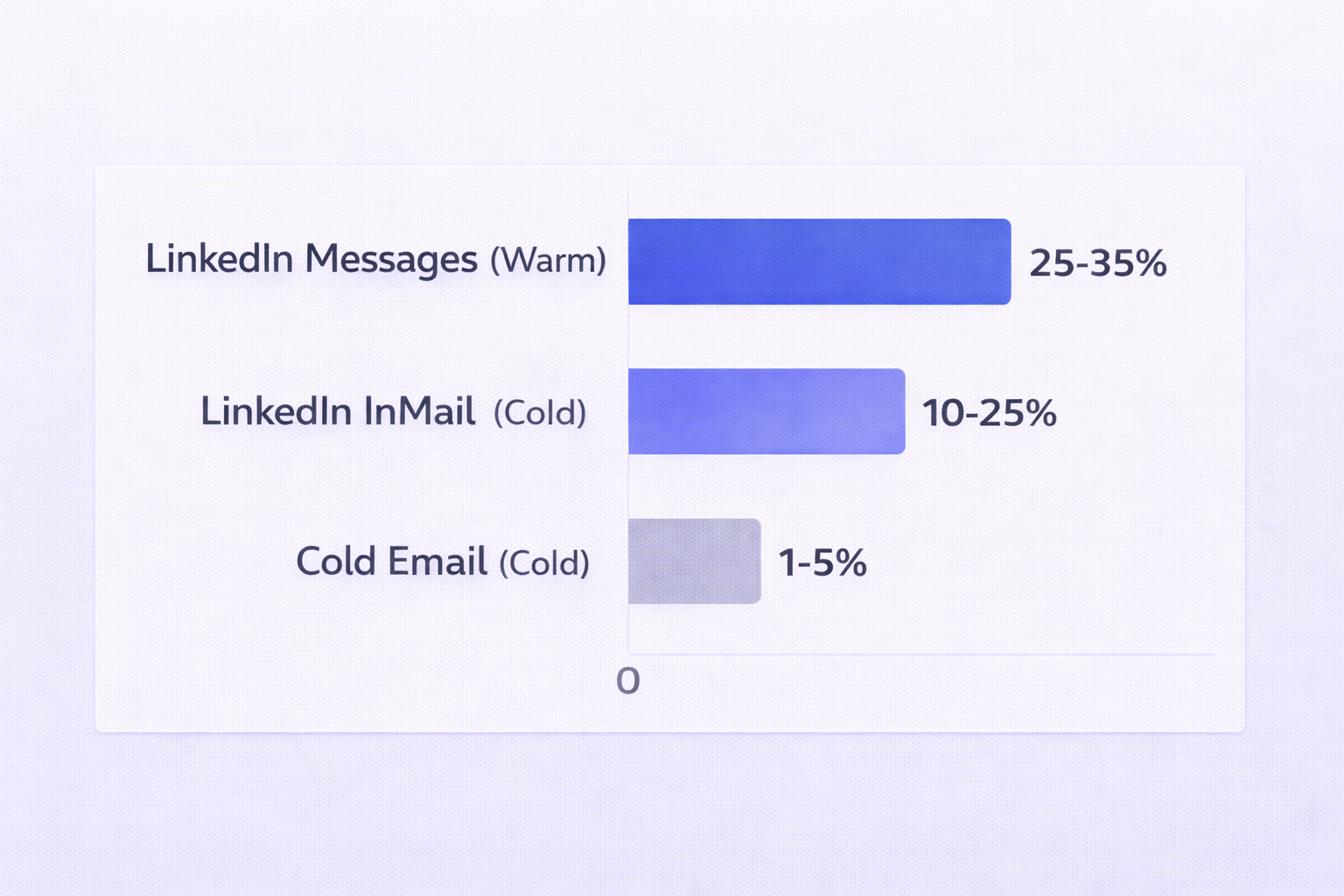 Metric | LinkedIn Message (Warm) | LinkedIn InMail (Cold) | Cold Email (Cold) |