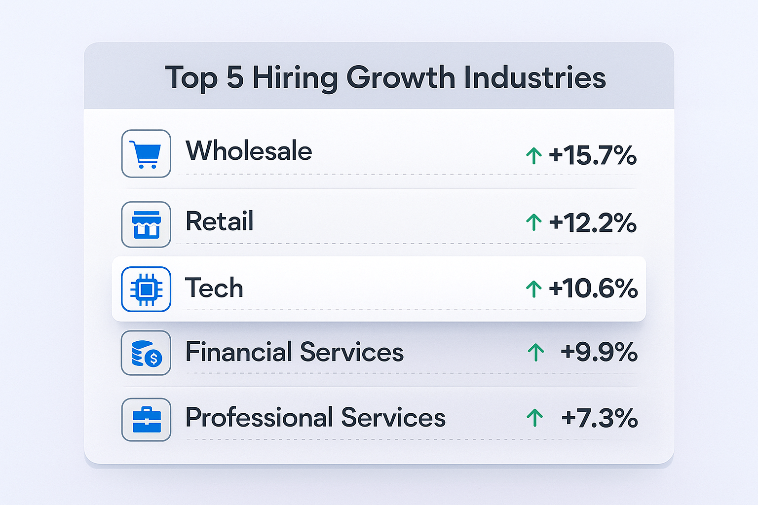 • Wholesale sector jumped 15.7% month-over-month in July 2025 – showing the highest hiring velocity among all industries
