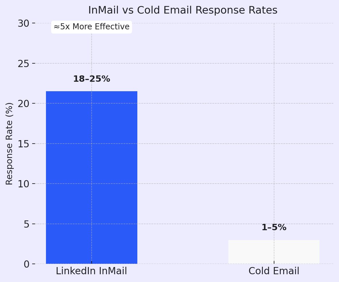 • LinkedIn InMail response rates: 18% to 25% – compared to cold email’s 1-5%, making InMail 5x more effective