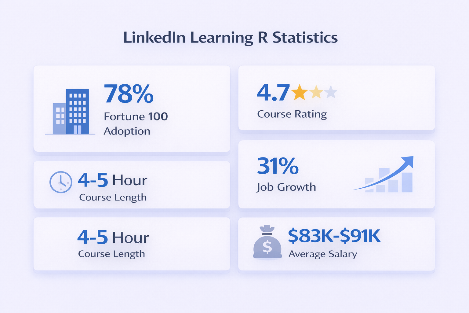 LinkedIn Learning’s R statistics courses represent the most efficient path from spreadsheet dependency to data science capability. With 78% of Fortune 100 companies investing in the platform, 4.7-star average ratings on flagship courses, and 31% job growth in data-related roles, the ROI is undeniable.