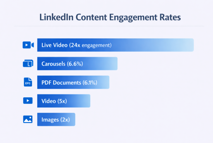 Video dominates everything. Native video posts receive 5x more engagement than static posts. Live video crushes even harder with 24x more engagement.