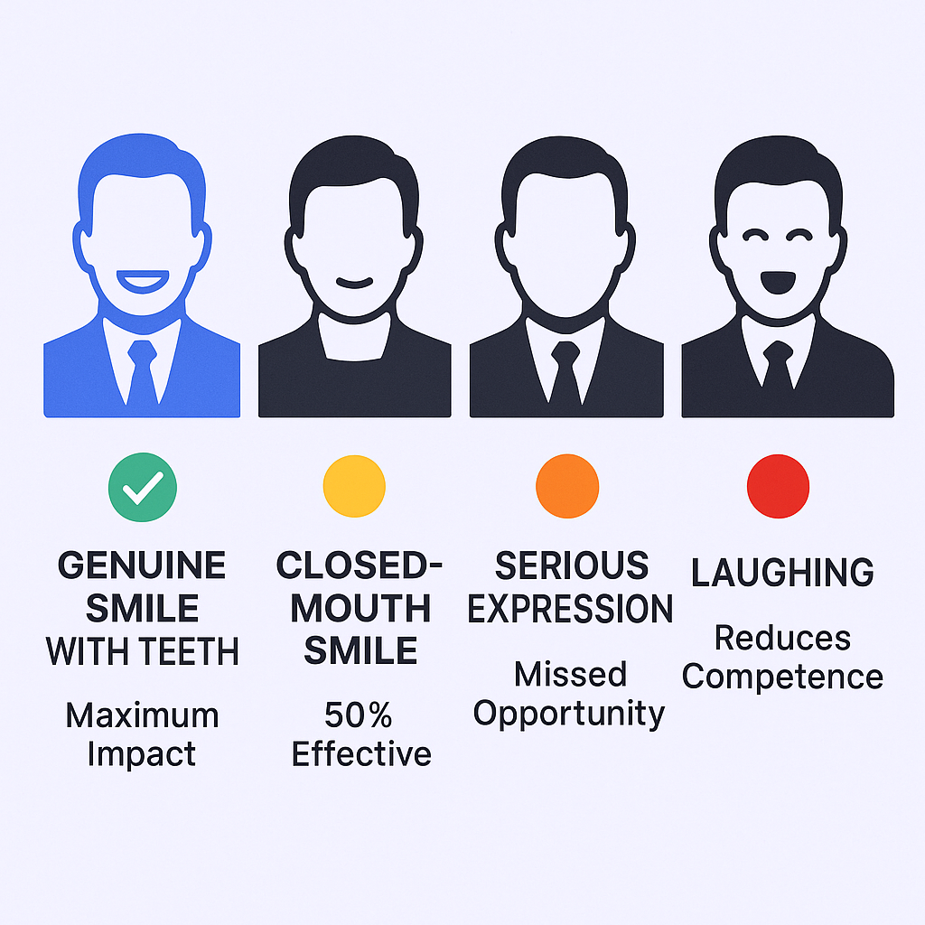 Here’s what most professionals get wrong: they think “professional” means serious. Wrong. A genuine smile with teeth visible has the most significant impact on perceived competence, likeability, and influence according to Photofeeler research.