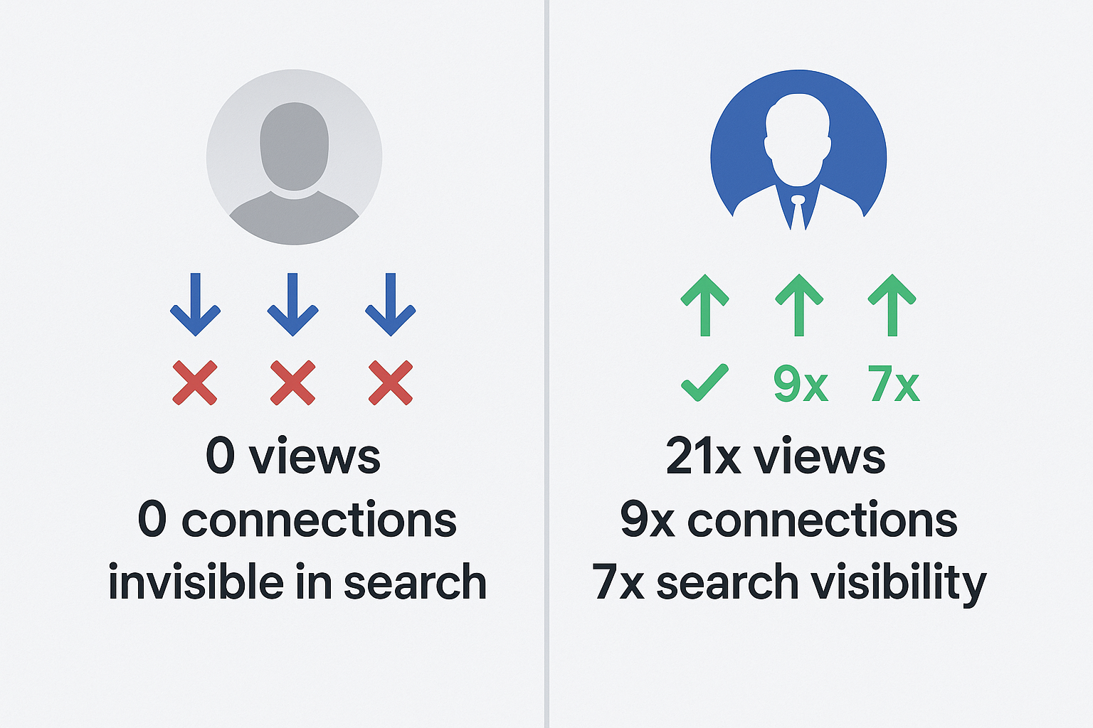 Here’s what this looks like in real terms: Two salespeople with identical experience. One has a professional headshot, the other doesn’t. The one with the photo gets 7x more visibility in searches, 9x more connection requests, and 36x more conversations. Same skills. Wildly different results.