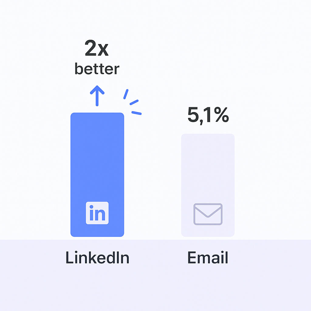 Here’s the game-changer: LinkedIn sales success isn’t about choosing between LinkedIn and email – it’s about using both strategically. LinkedIn messages achieve a 10% response rate, nearly double the 5.1% average for cold emails.