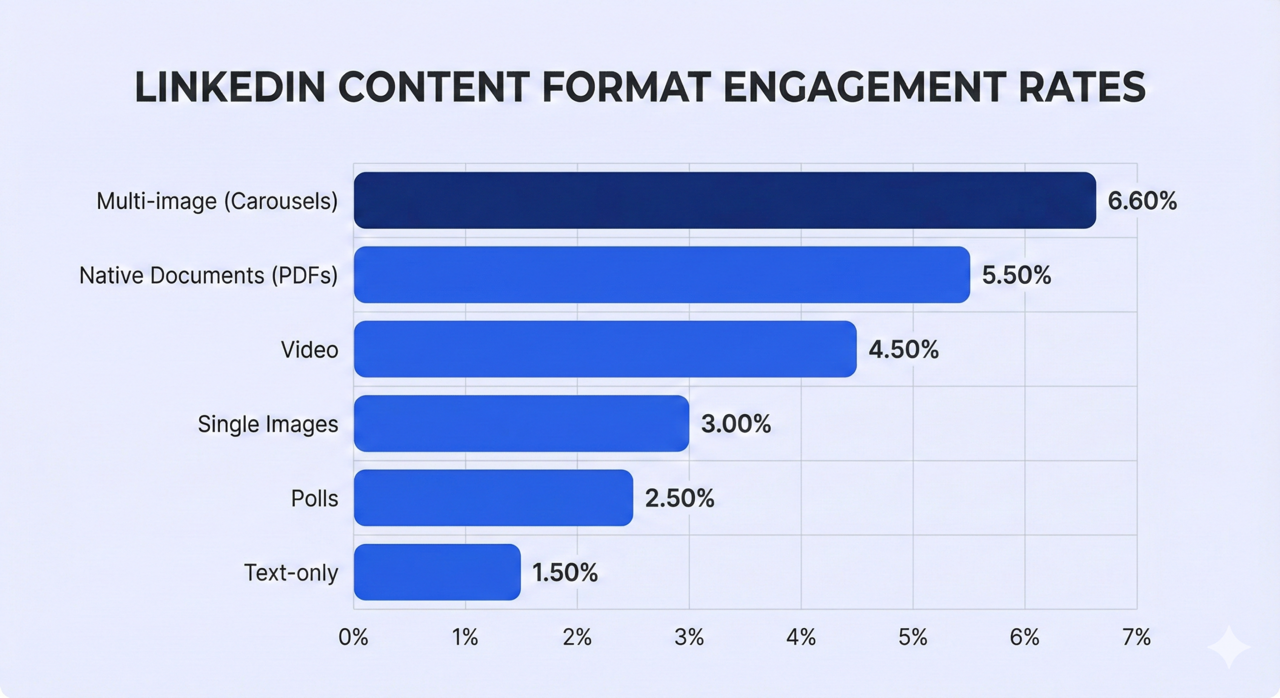 - Multi-image carousel posts: 6.60% average engagement – highest-performing format because active clicking/swiping signals to algorithm that content deserves wider distribution