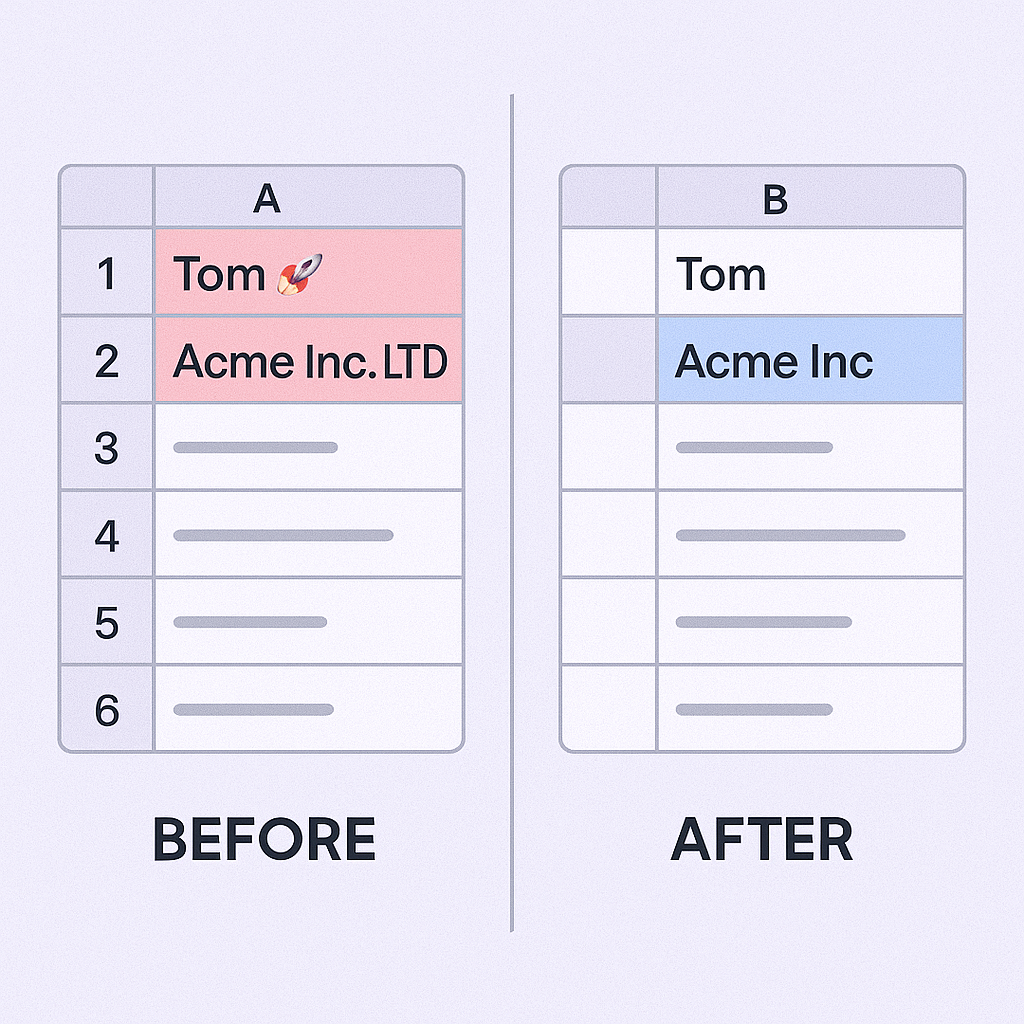 Evaboot’s technology double-checks every lead against your exact filter criteria and flags the bad ones. It also auto-cleans messy data: “Tom 🚀” becomes “Tom,” and “Acme Inc. LTD” becomes “Acme Inc.”