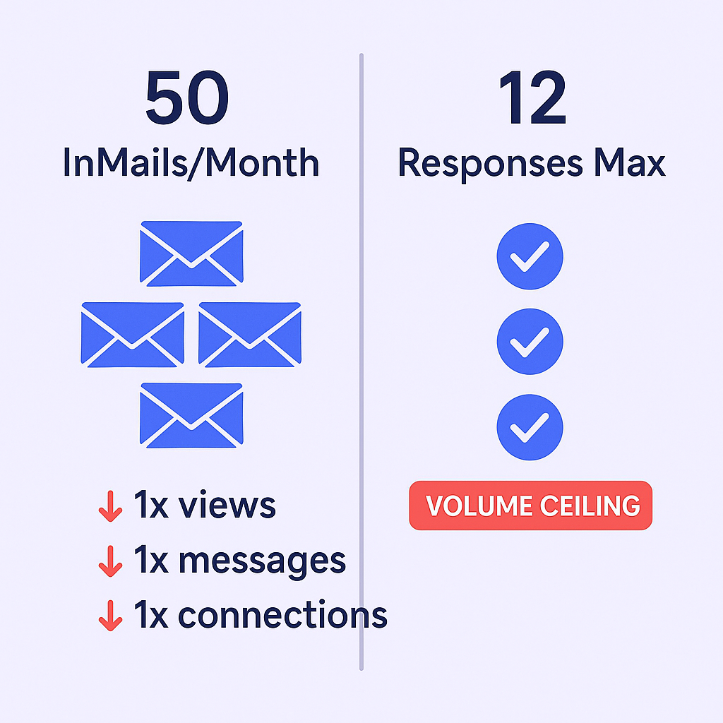 Only 50 InMails per month – even at 25% response rate, that’s just 12 conversations monthly, creating a hard volume ceiling