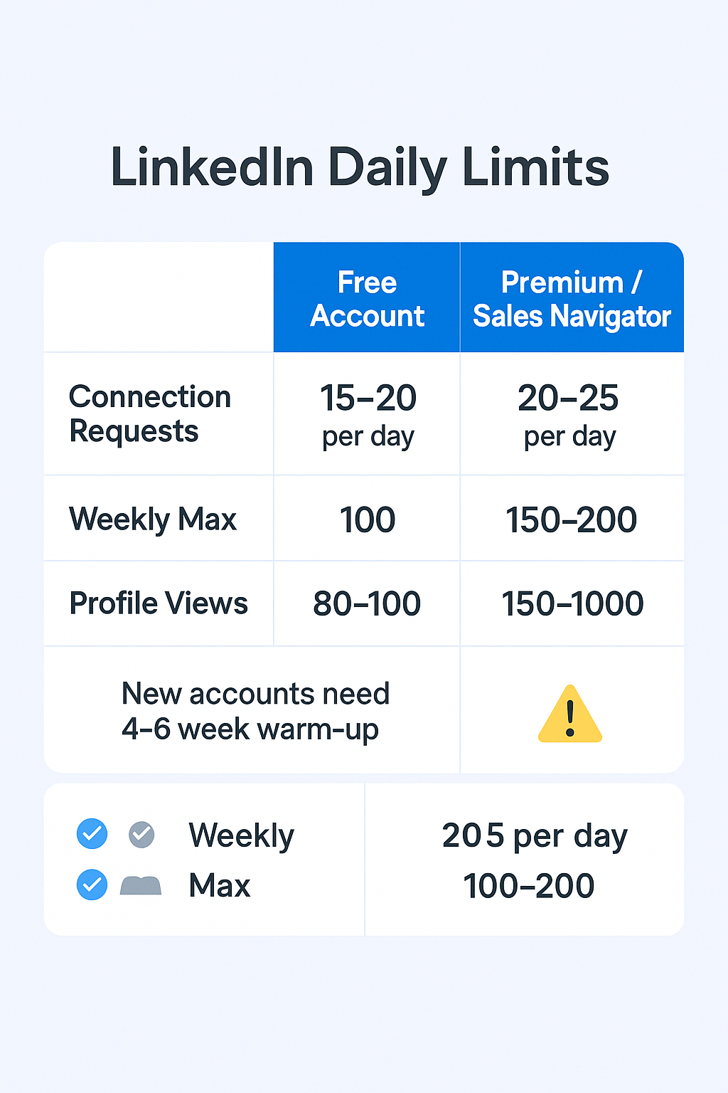 Free accounts should stick to 15-20 connection requests daily (max 100 per week). Premium and Sales Navigator users can push 20-25 daily (max 150-200 per week).