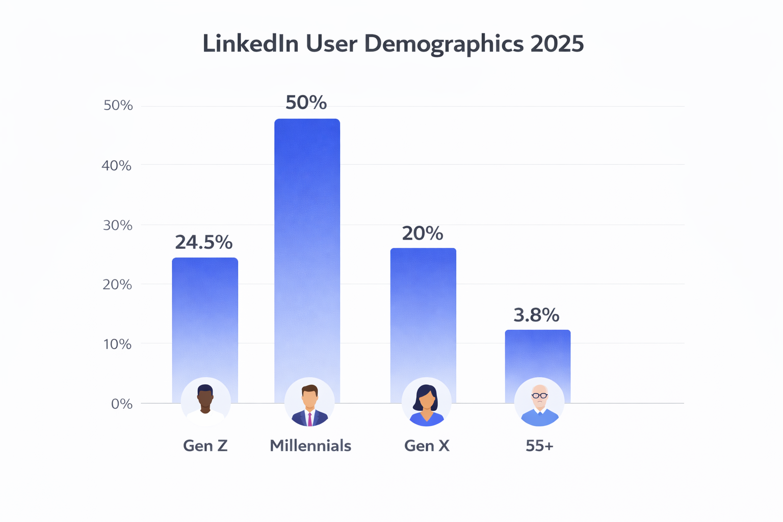 - Millennials (25-34) dominate at 47.3-50.6%, Gen Z (18-24) fastest-growing at 24.5-28.7% – Gen Z treating LinkedIn like TikTok prioritizing video, personal branding, authentic storytelling over traditional corporate posts